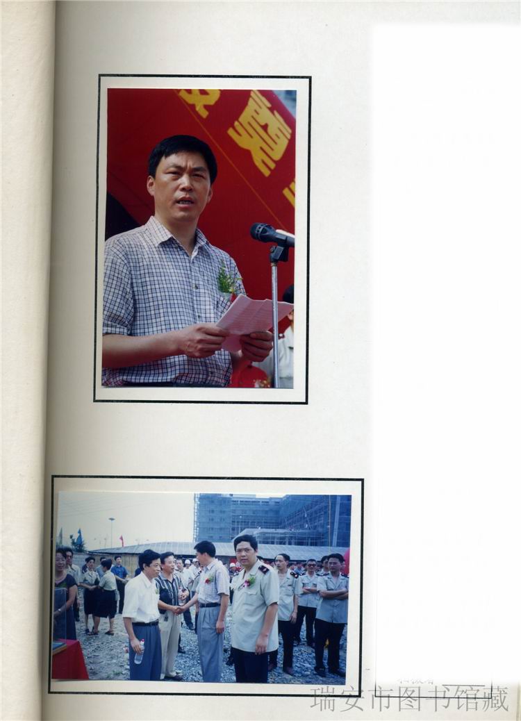 1998年地税大楼开工奠基典礼,瑞安市市长黄宗华同志讲话,瑞安市市长黄宗华、财政地税局局长陈征宇与前来的各地市领导来宾握手致谢。